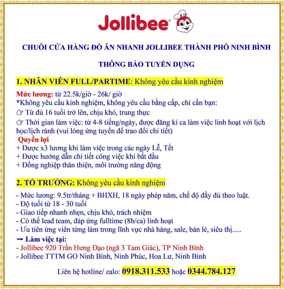 Chuỗi cửa hàng đồ ăn nhanh JOLLIBEE Thành phố Ninh Bình